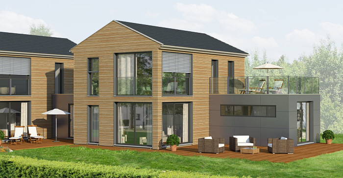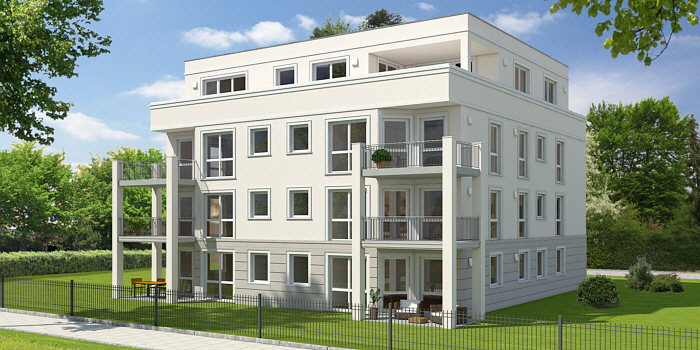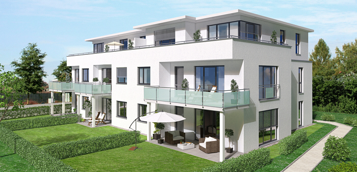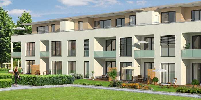 Eingabe-Plänen bzw. der Werkplanung 3D-Gebäude-Illustrationen für Bauträger und für den Immobilienvertrieb. Wohnanlagen, Wohnhäuser, Mehrfamilienhäuser,